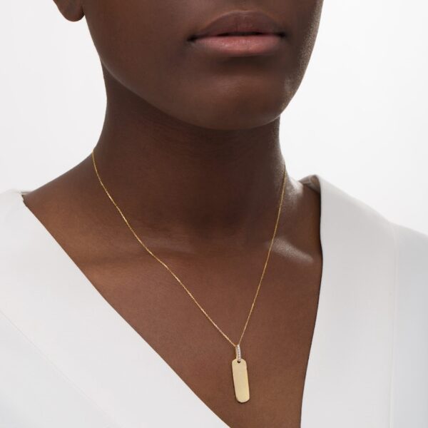 Wear your values with pride with this statement-making diamond pendant. Crafted in warm 10K gold, this petite tag features the word inscribed vertically along the center. Diamonds line the bail for a hint of sparkle. Captivating with 1/20 ct. t.w. of diamonds and a bright polished shine, this pendant suspends along a 16.0-inch cable chain with 2.0-inch extender that secures with a spring-ring clasp. This exclusive fine jewelry collection inspires you to wear your strength, confidence and power.