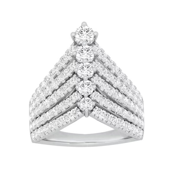 Crafted in cool 10K white gold, this beautiful design showcases five V-shaped ribbons that are adorned with diamonds. Large diamonds accentuate the center in a vertical arrangement, increasing in size from 1/20 carat on one side to 1/6 carat on the other. Mesmerizing with 2 carats of diamonds and brilliant polish, this ring will dazzle the eye.