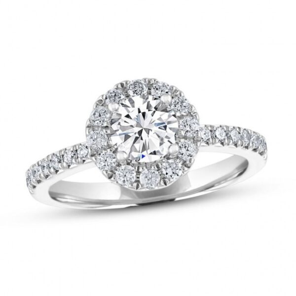 Shimmering round diamonds halo a brilliant round diamond at the center of this eye-catching Diamond engagement ring. Additional diamonds line the 14K white gold band to bring the ring’s total diamond weight to 1 1/8 carats.