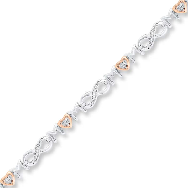 The word “mom” alternates with infinity symbols decked in diamonds in this pretty bracelet for her, styled in sterling silver. Hearts of 10K rose gold complete the look. Totaling 1/10 carat in diamond weight, the 7.5-inch bracelet secures with a lobster clasp.
